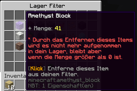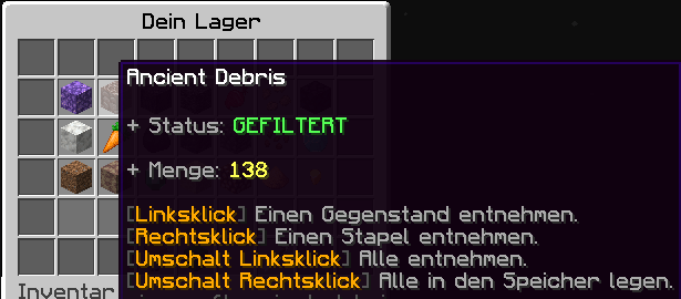 1. Um ein Item automatisch ins Lager beim Abbauen oder Einsammeln einzulagern, muss ein Filter gesetzt werden im Fenster Filter.