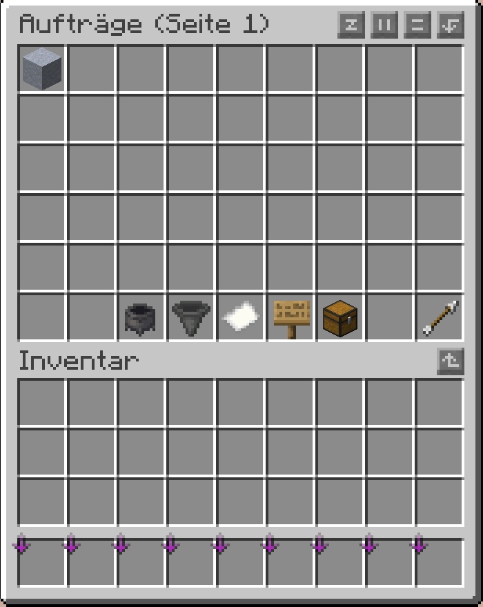 2. Mit Trichter könnt ihr den Filter umschalten das euch nur Aufträge zu bestimmten Item arten angezeigt werden. (Alles, Blöcke, Werkzeug, Essen, etc...)